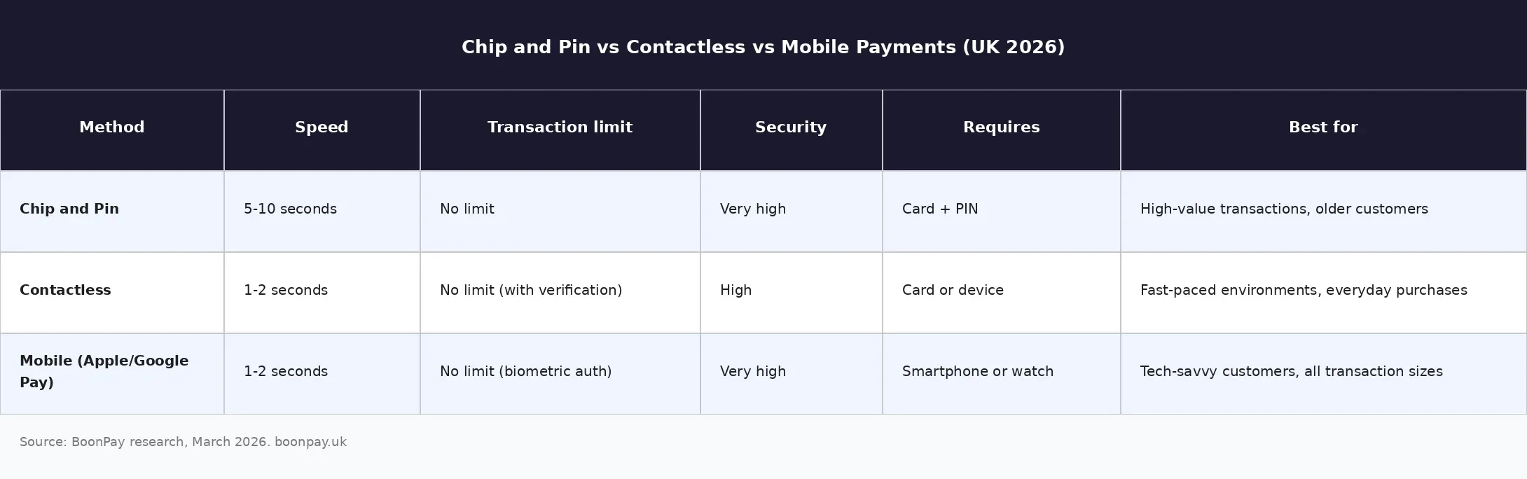 Contactless is very secure, but chip and pin carries a slightly lower fraud risk for high-value transactions because it requires the customer to know their PIN. For everyday purchase values, contactless fraud rates in the UK are extremely low. Mobile payments via Apple Pay and Google Pay are arguably the most secure of all, because every transaction requires biometric authentication from the customer's device before it is processed.